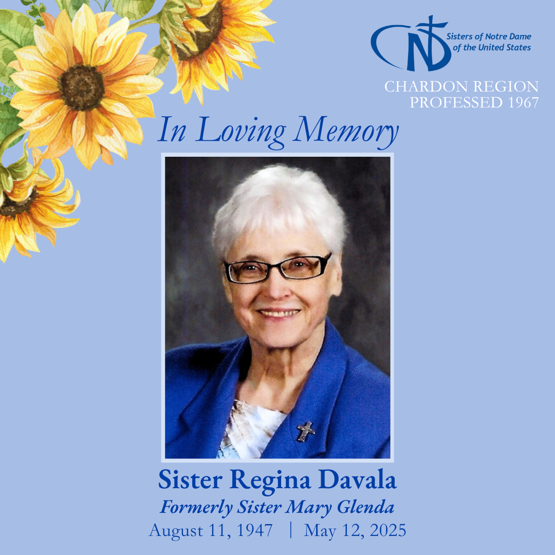 Sister Regina Davala, SND(Formerly Sister Mary Glenda)August 11, 1947 – May 12, 2025Professed August 16, 1967 Besides the autobiography that Sister Regina wrote before entering the Sisters of Notre Dame in 1965, she composed a…