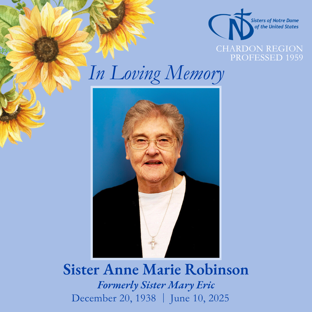 Sister Anne Marie Robinson, SND(formerly Sister Mary Eric)December 20, 1938 – June 10, 2025Professed August 16, 1959 “Do not be hasty to speak, or impulsive to make a speech before God. God is in heaven…