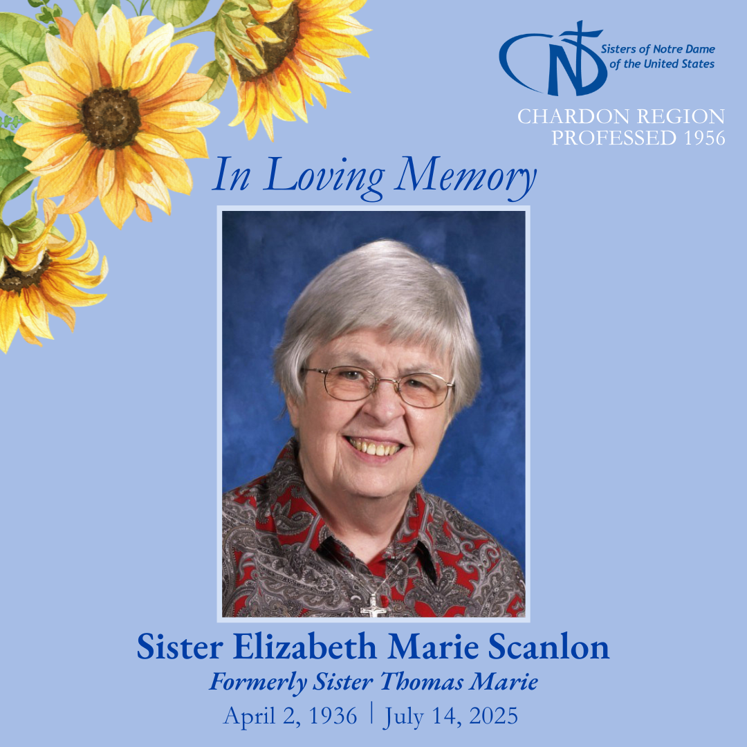 Sister Elizabeth Marie Scanlon(Formerly Sister Thomas Marie)April 2, 1936 – July 14, 2025Professed August 16, 1956 Elizabeth Ruth Scanlon was the first child of Thomas and Marie Grady Scanlon, born on April 2, 1936. Her…