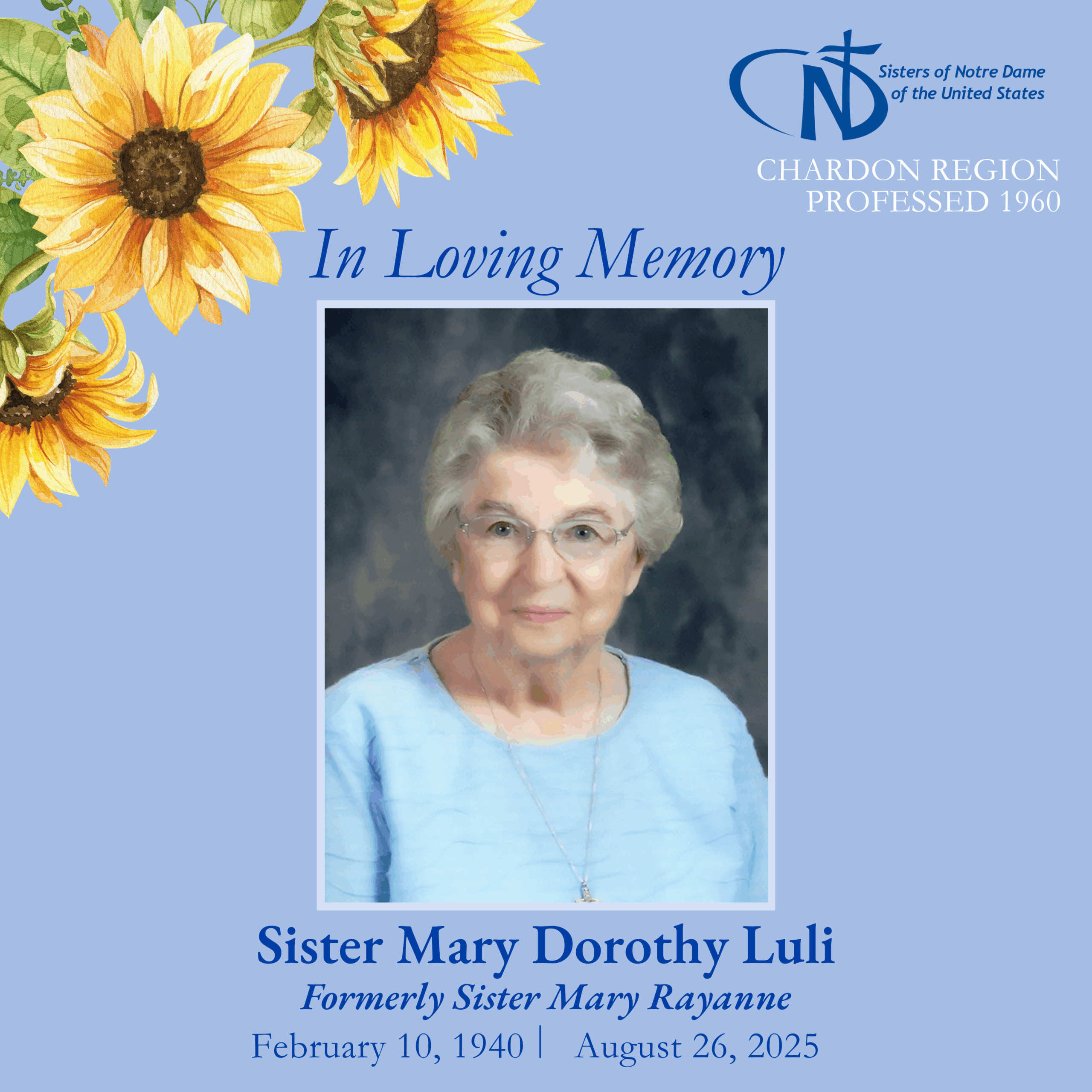 Sister Mary Dorothy Luli, SND (Formerly Sister Mary Rayanne)February 10, 1940 – August 26, 2025Professed: August 16, 1960 Dorothy was born on February 10, 1940, to George and Mary Louise (Hostler) Luli, the ninth of…