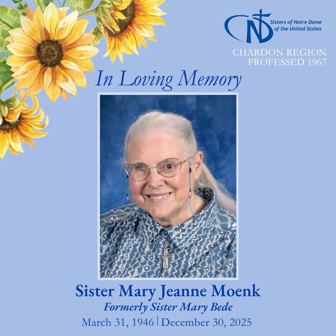 Sister Mary Jeanne Moenk, SND(Formerly Sister Mary Bede)March 31, 1946 – December 30, 2025Professed August 16, 1967 Born on March 31, 1946, to Jean and Rita (Remay) Moenk, Jeanne spent her early years in Cleveland,…