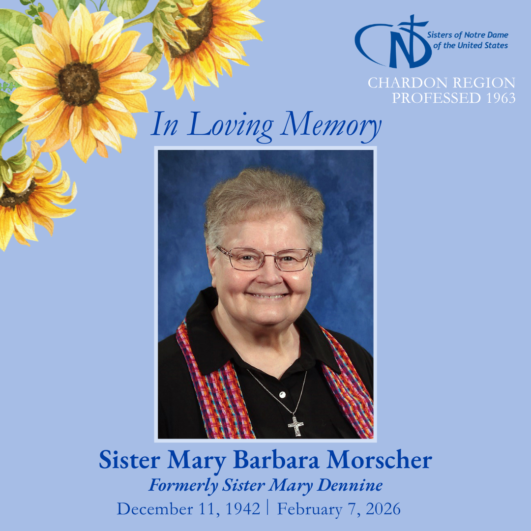 Sister Mary Barbara Morscher, SND(formerly Sister Mary Dennine)December 11, 1942 – February 7, 2026Professed January 3, 1963 The Mass of Christian Burial will be celebrated on Friday, February 20, at 10:30 a.m. at the Sisters…