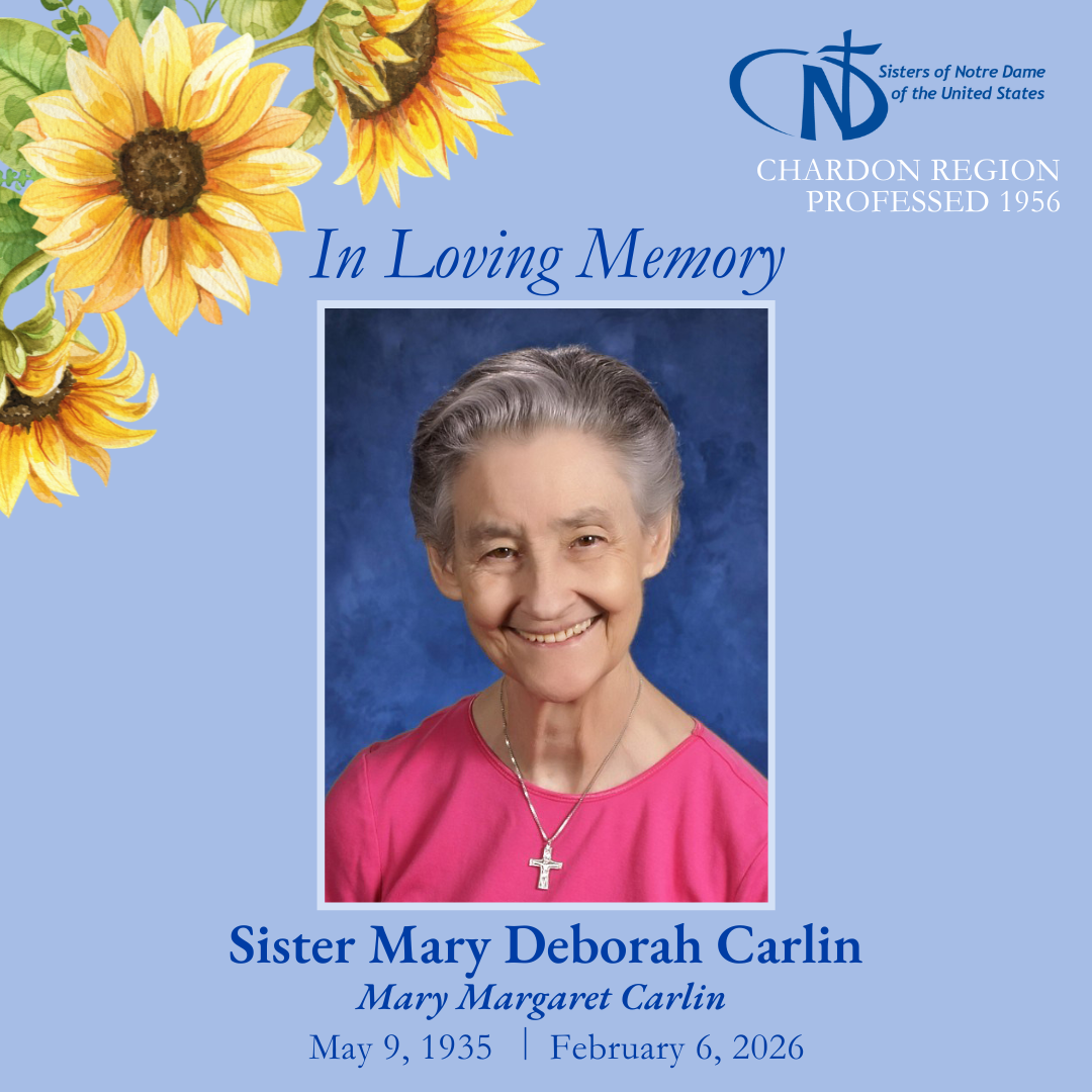 Sister Mary Deborah Carlin, SND(Mary Margaret Carlin)May 9, 1935 – February 6, 2026Professed August 16, 1956 Mary Margaret Carlin was born on May 9, 1935 in Cleveland, Ohio to Margaret (Leneghan) and Michael Carlin. Joy…