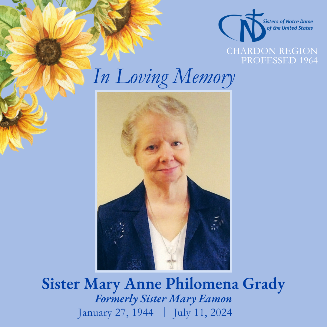 Sister Mary Anne Philomena Grady(formerly Sister Mary Eamon)January 27, 1944 – July 11, 2024Professed: 1964 Anne Philomena Grady was born on January 27, 1944, in Cleveland, Ohio, the youngest of six children of Michael and…