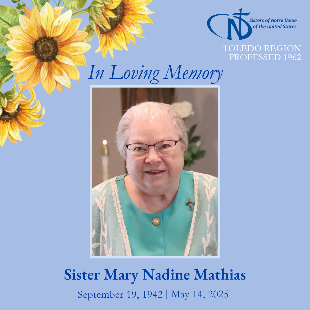 Sister Mary Nadine Mathias, SNDSeptember 19, 1942 – May 14, 2025Professed August 13, 1962 Sister Mary Nadine Mathias, 82, someone who took notice and lived out of the Word of God both in her own…