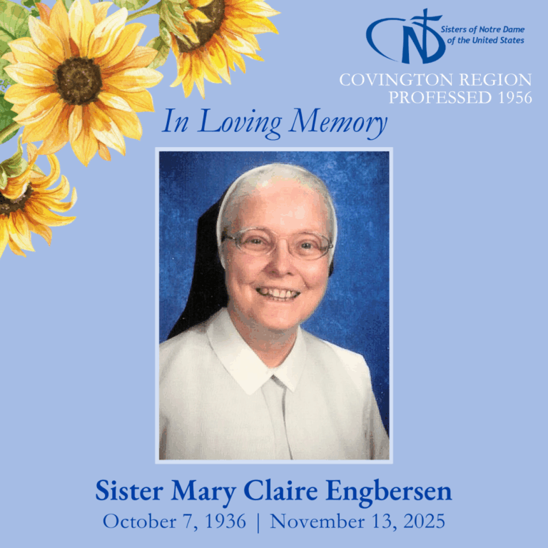 Rose Marie Engbersen was born on October 7, 1936, and grew up in Oakley, Ohio, attending St. Cecilia School and Parish. Drawn to religious life from a young age, she entered the Sisters of Notre Dame on February 2, 1954, and professed vows in 1956, receiving the name Sister Mary Claire.