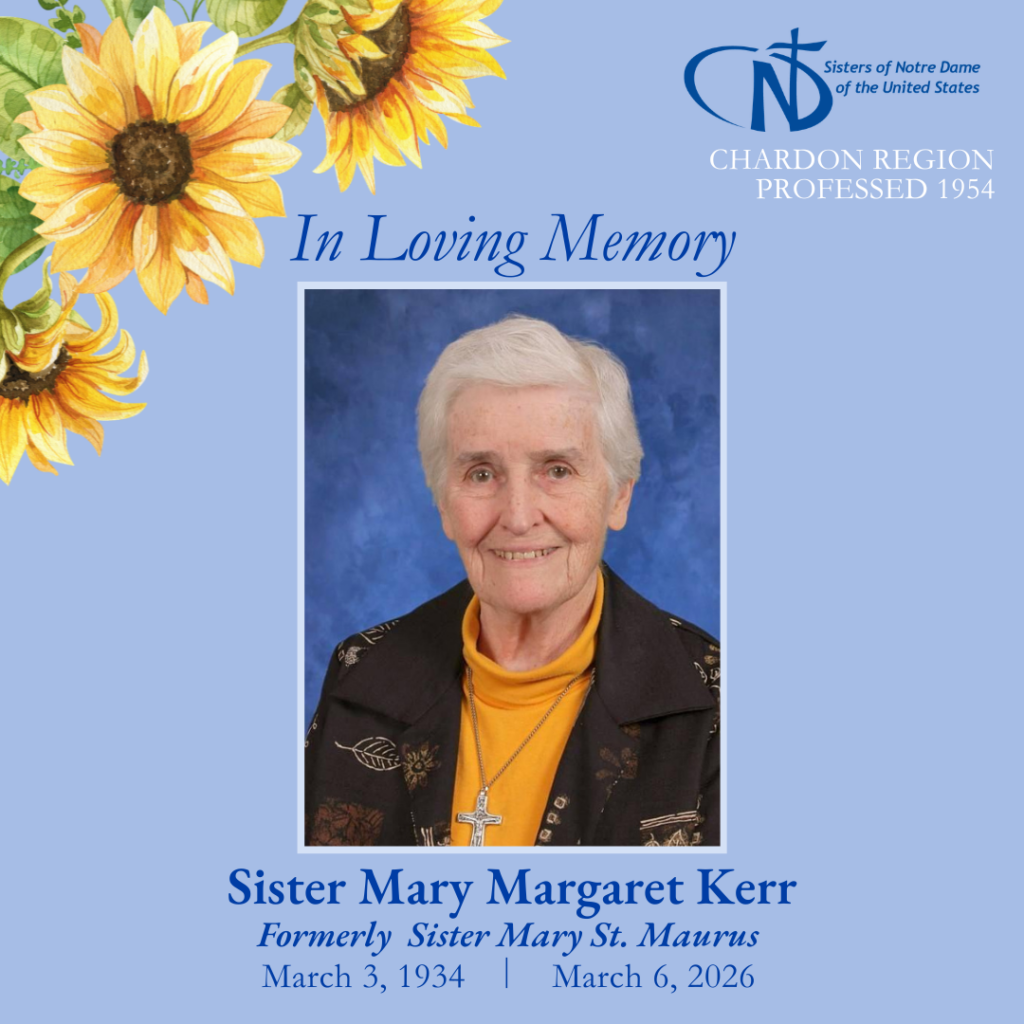 Margaret was the youngest of the six children born to Maurice and Edith (Ford) Kerr on March 3, 1934, in Cleveland. She joined her siblings in their Cleveland Heights home in St. Ann Parish, where the children attended school and received the sacraments. Margy was playful, full of energy, delighted in learning and participating in any sport. While a student at Notre Dame Academy in Cleveland, she realized that becoming an aspirant would help her move into religious life faster. Margy entered the community as a postulant on February 2, 1952. At investment, she received the name Sister Mary St. Maurus.